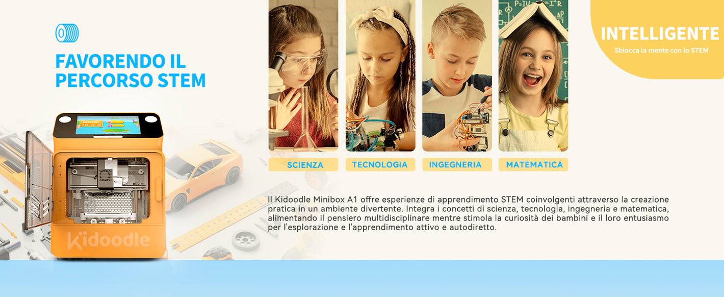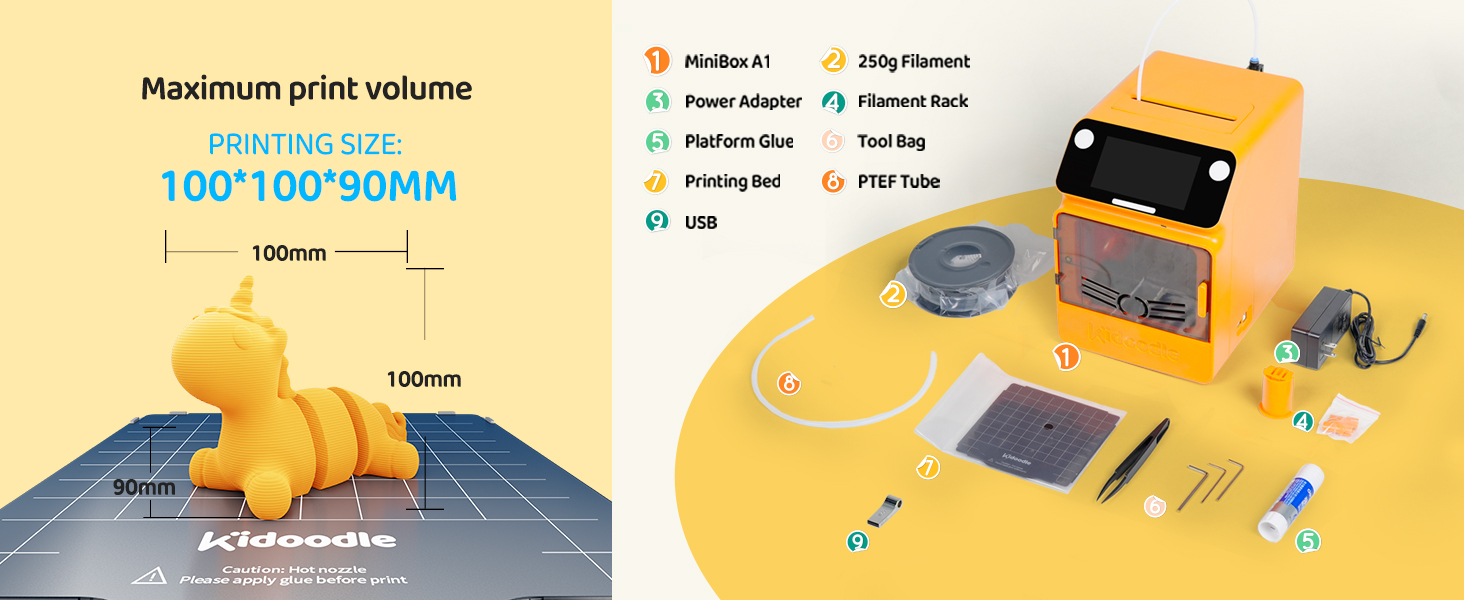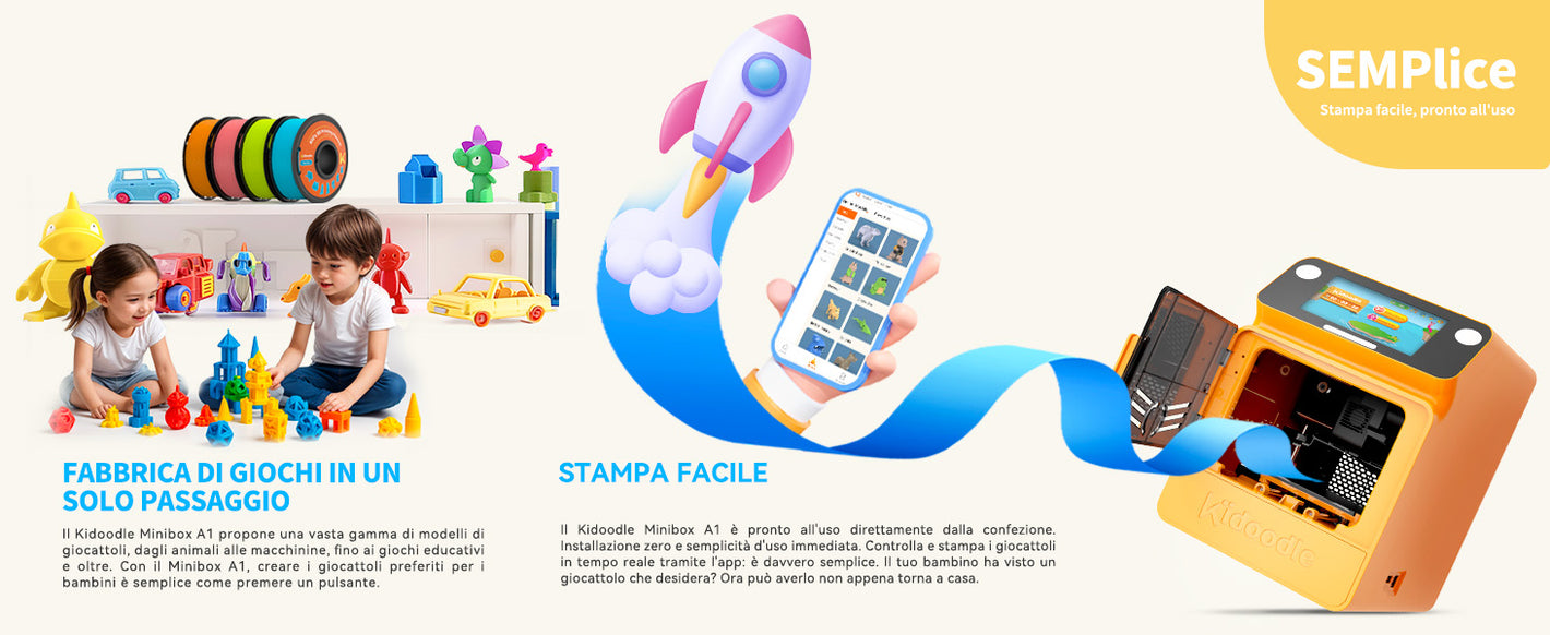 La Kidoodle MiniBox A1 è più di una semplice stampante 3D: è una compagna creativa progettata per liberare l'immaginazione dei bambini. Perfetta per i bambini dai 6 ai 14 anni, questa stampante facile da usare trasforma le idee in realtà con facilità.