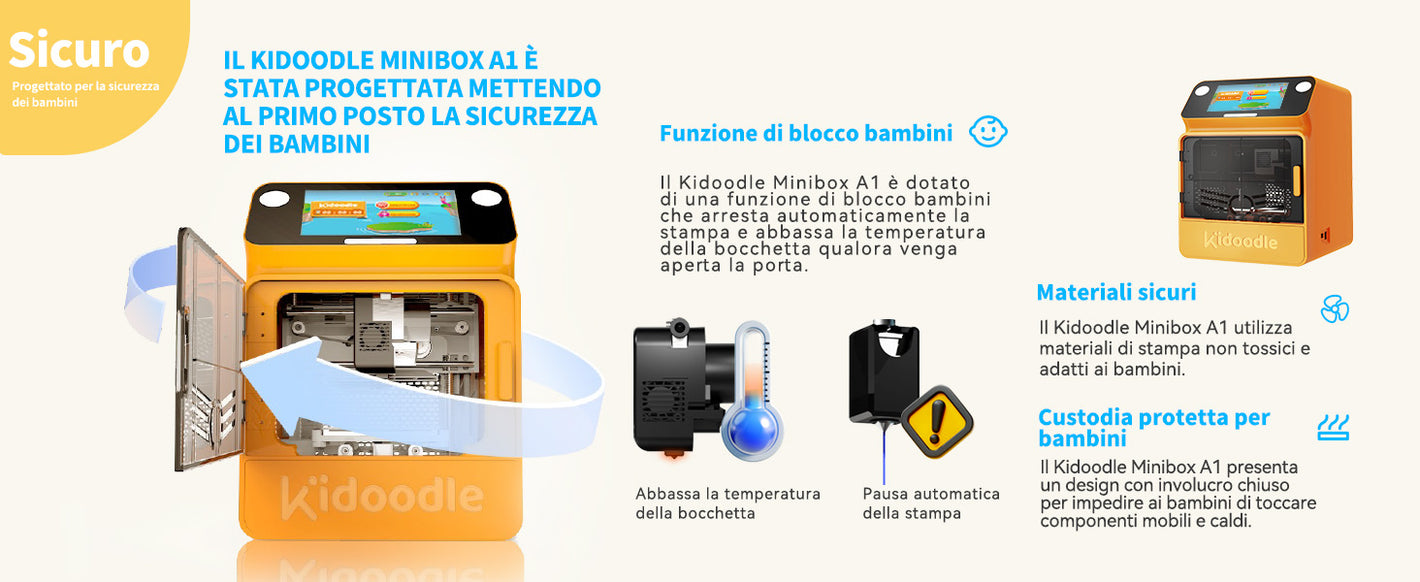 [Blocco di sicurezza per bambini] Struttura completamente chiusa con pausa automatica della stampa e riduzione della temperatura dell'ugello se lo sportello viene aperto. Prevenzione degli incidenti.