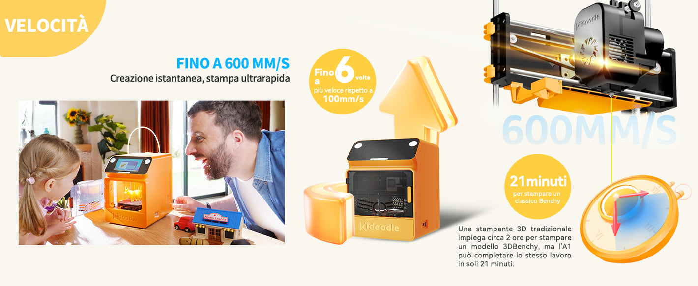 Stampa ultraveloce: a 600 mm/s, Kidoodle MiniBox A1 completa un tipico modello 3D in soli 21 minuti, 6 volte più velocemente delle stampanti convenzionali che impiegano circa 2 ore. Questa alta velocità non compromette la qualità, a differenza delle macchine normali con velocità di soli 200-300 mm/s.