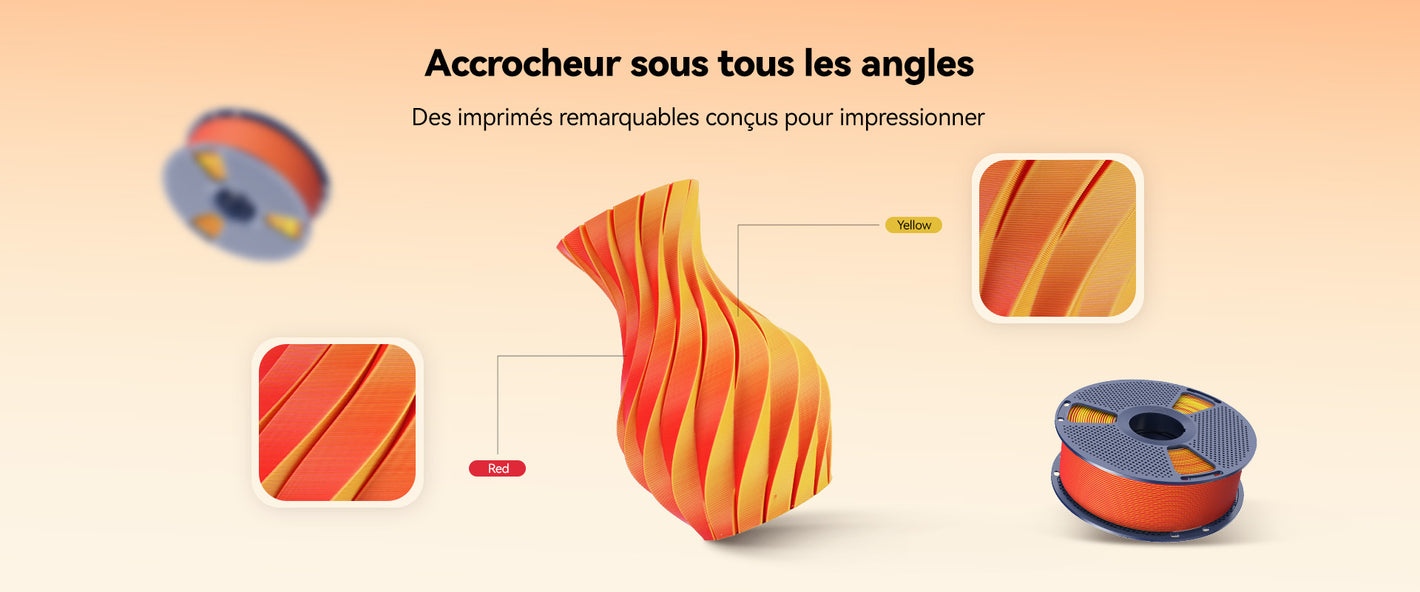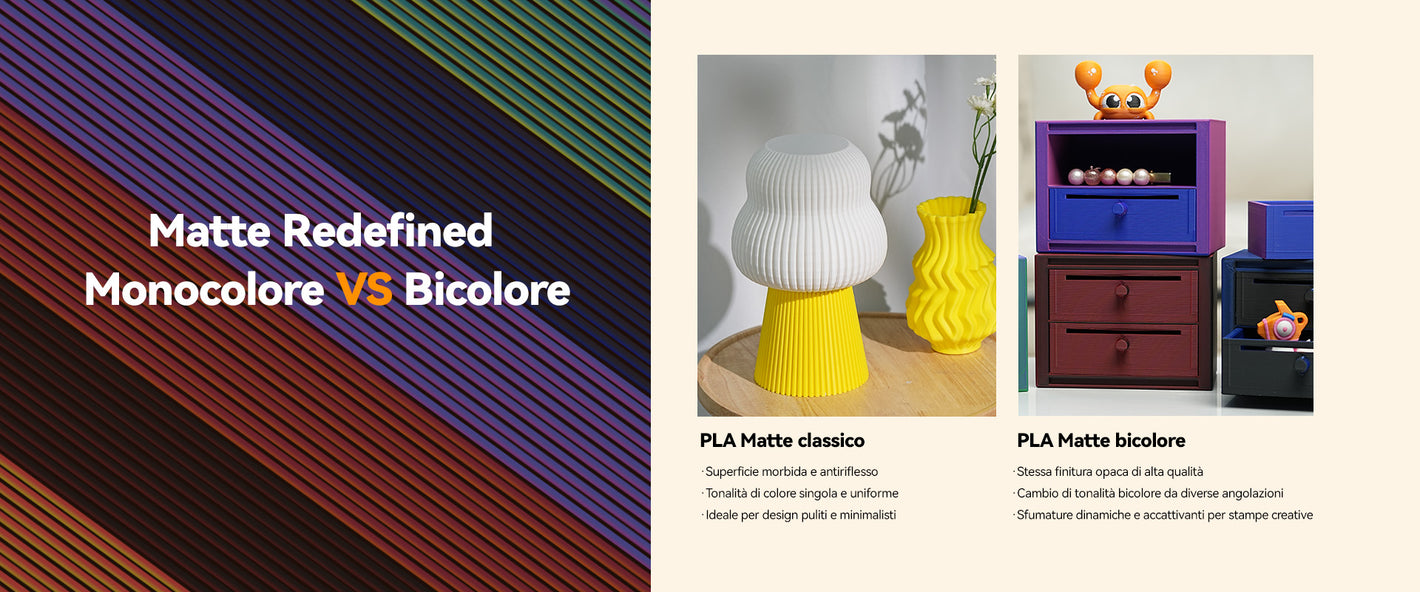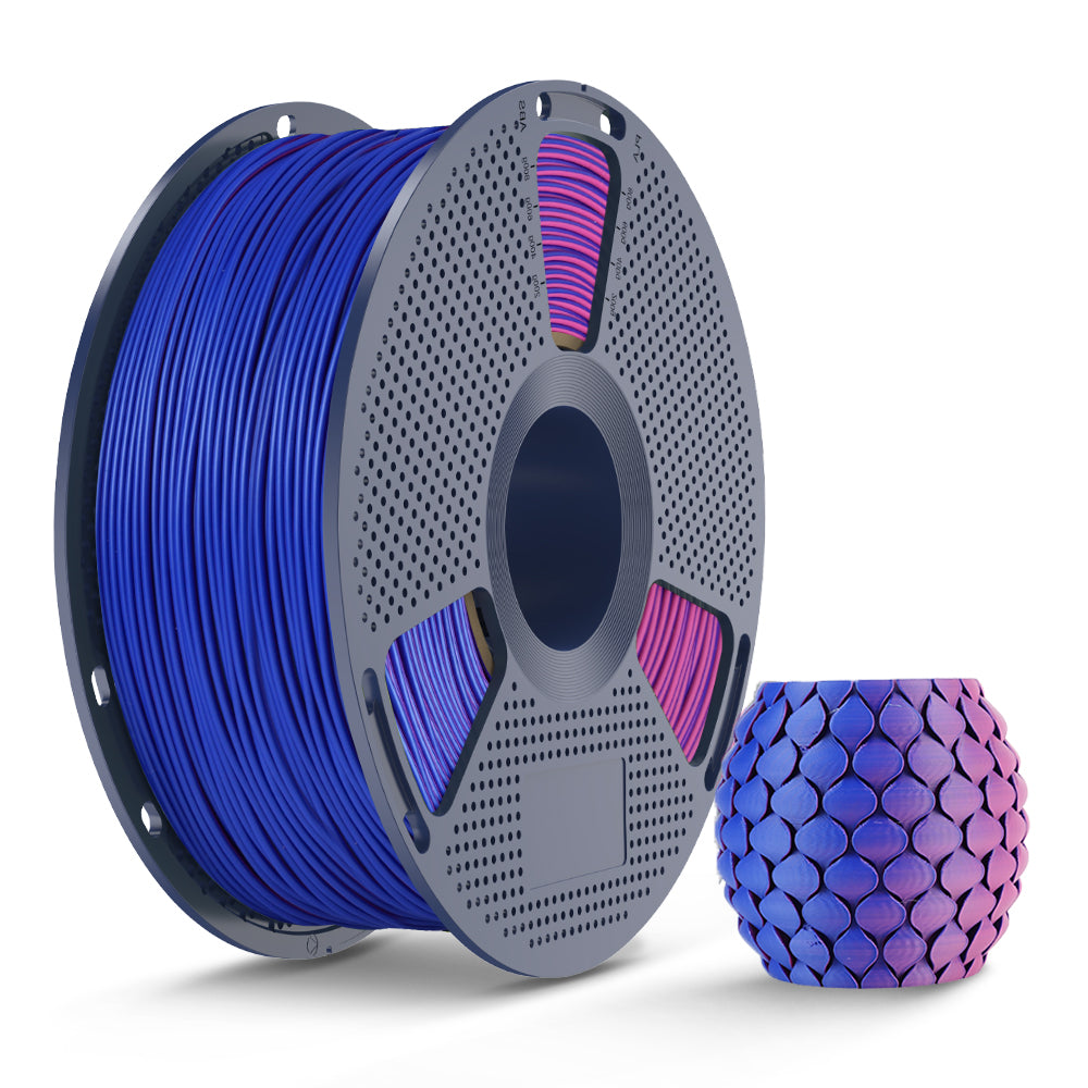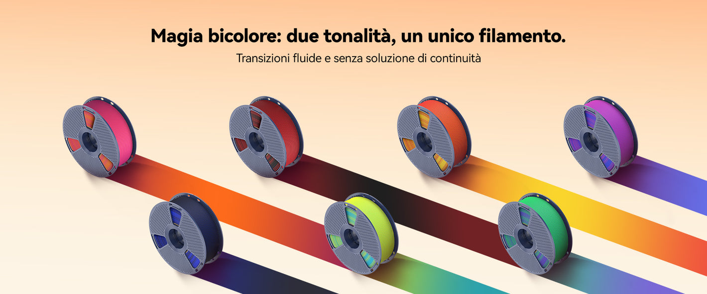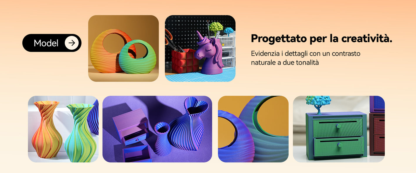Il filamento produce una superficie naturalmente morbida e non riflettente che elimina i riflessi. Perfetto per stampe artistiche e decorative in cui una texture matte sofisticata valorizza il design complessivo. Goditi due colori distinti in un unico filamento. Le diverse superfici del modello rivelano toni differenti, creando transizioni fluide e naturali – ideale per accessori unici, arte decorativa e modelli personalizzati.