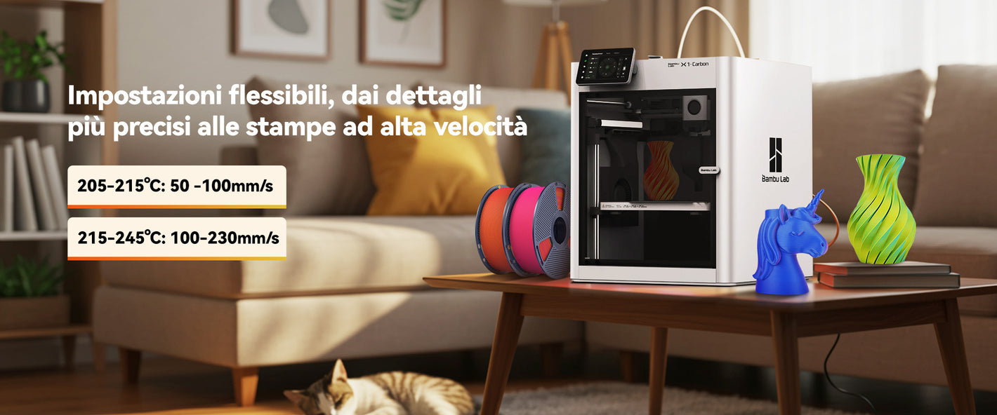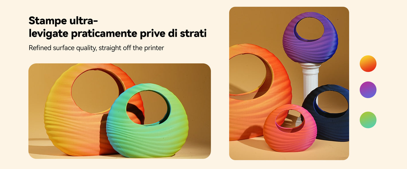 La fusione dei colori è liscia e senza soluzione di continuità, senza linee nette tra i toni, donando ai modelli un’estetica raffinata e professionale. Progettato per un’estrusione ultra-liscia, questo filamento riduce le linee di strato visibili e garantisce una finitura lucidata direttamente dalla stampante, minimizzando i lavori di post-elaborazione.